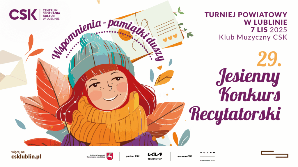 Już w najbliższy piątek w Klubie Muzycznym Centrum Spotkania Kultur w Lublinie (Plac Teatralny 1, 20-029 Lublin, poziom -1) rozpocznie się Turniej Powiatowy 29. Jesiennego Konkursu Recytatorskiego. Przez cały dzień wysłuchamy ponad 50 prezentacji recytatorów z powiatu lubelskiego ziemskiego i grodzkiego oraz świdnickiego, którzy w tym roku inspirowali się tematem „Wspomnienia – pamiątki duszy”.