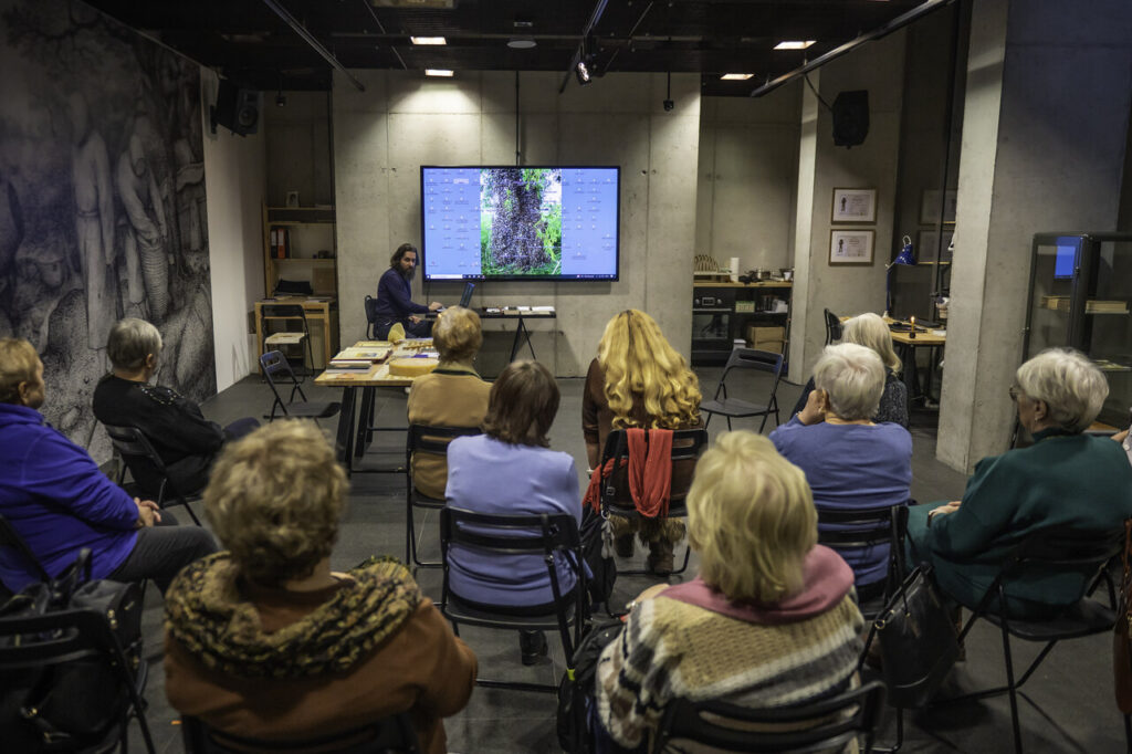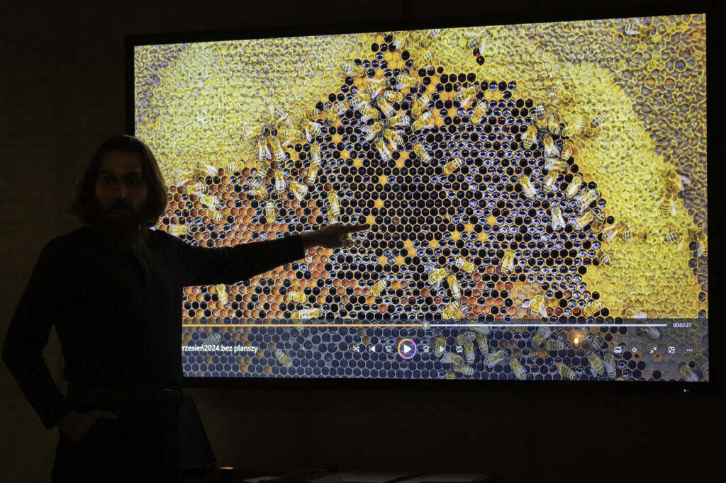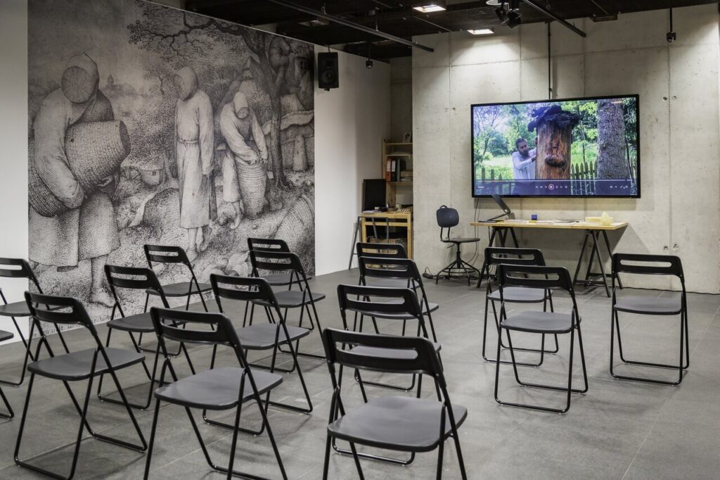 Sala Pszczelarska na poziomie -1 przeznaczona jest do całorocznych spotkań i zajęć. Prezentacje składają się z autorskich materiałów fotograficznych, specjalnie przygotowanych filmów wideo na dużym ekranie telewizyjnym, prezentacji z projektorów na ścianach (na bazie dźwięków i grafiki komputerowej) oraz okulary do VR. Ważnym elementem są realne obiekty pochodzące od pszczół (np. plastry woskowe, płótna ulowe, przetopiony wosk pszczeli itp.) oraz obiekty takie jak książki i artefakty kultury pszczelarskiej, na bazie których opowiadamy o historii pszczół i ludzi. Nasze zajęcia dotyczą nie tylko samego pszczelarstwa ale też kultury, która wyrosła wokół bartnictwa i pszczelarstwa na przestrzeni wieków.